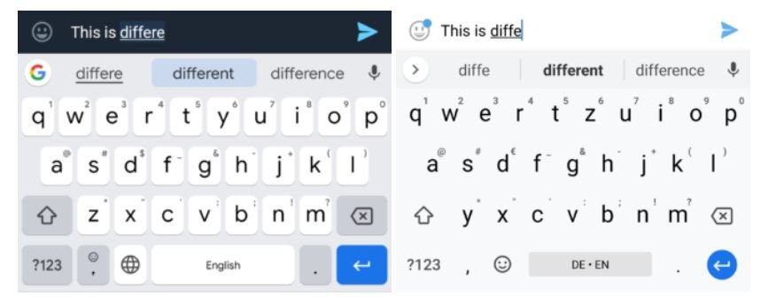 Auf dem linken Screenshot seht ihr die neue Darstellung, auf dem rechten die noch aktuelle Version. Der Rest der veränderten Darstellung gehört nicht zu den Veränderungen. Das linke Wort wird nun unterstrichen und verdeutlicht, dass dies aktuell getippt wird. Der mittlere Vorschlag ist nun blau unterlegt und zeigt, welches Wort die automatische Korrektur nun vorschlägt. Rechts daneben befindet sich jeweils eine Alternative.