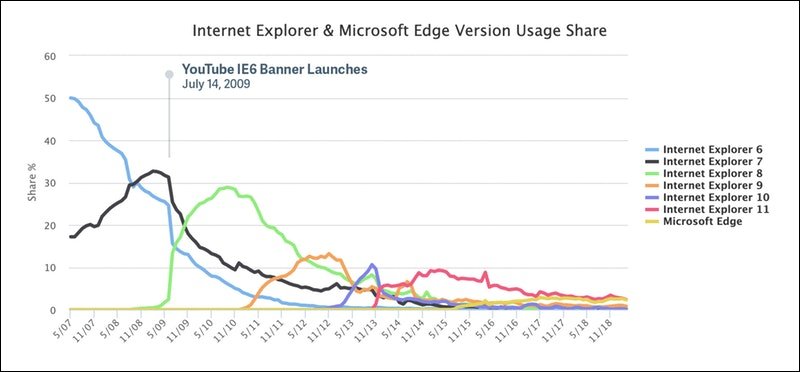 Damals hatte der Browser zwar schon einen stetig fallenden Marktanteil, kam aber noch immer bei über 30 Prozent der Internetnutzer und 19 Prozent der YouTube-Nutzer zum Einsatz. Deutlich zuviel, um ihn vollständig zu ignorieren oder die Nutzer gar auszusperren. Bei den Produktmanagern stieß man damals auf taube Ohren, doch das Team wusste sich mit einer fast schon als Nacht-und-Nebel zu bezeichnenden Aktion zu helfen. Und dieser Plan ging mehr als auf.