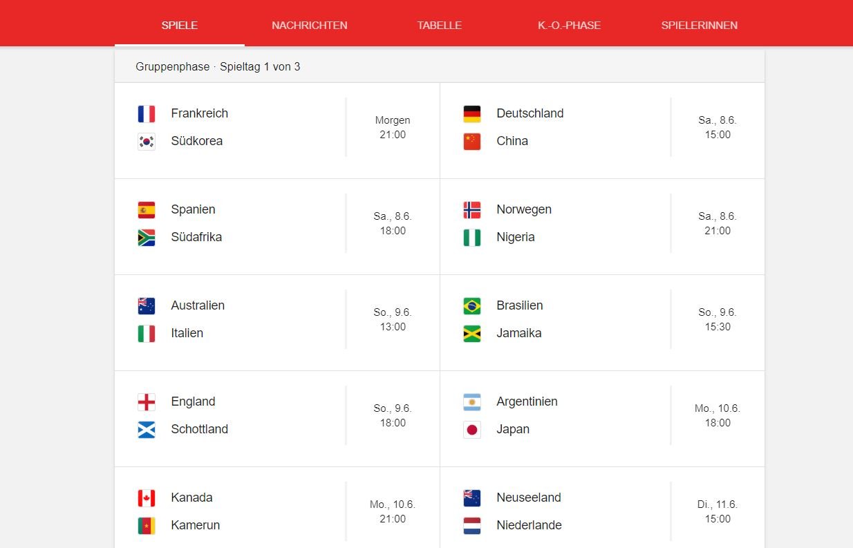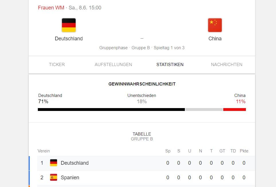Die Google Websuche informiert, so wie schon zur Fußball-WM der Herren im Jahr 2018, mit einer sehr ausführlichen Infobox in der Websuche. Darin findet ihr die aktuellen Begegnungen, den Spielstand bzw. Endstand und auch detaillierte Spielberichte mit vielen Statistiken, einem nachlesbaren Liveticker sowie vielen News-Quellen. Natürlich ist auch die aktuelle Tabelle zu finden, sowie ausführliche Informationen über jedes einzelne Land und jede Spielerin.