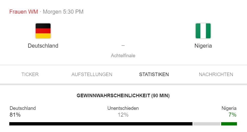 Wie obige Prognose von Google zeigt, sollte es für Deutschland ein Selbstläufer werden. Zu 81 Prozent wird Deutschland gewinnen, zu 12 Prozent geht es immerhin unentschieden aus und nur mit einer Wahrscheinlichkeit von 7 Prozent wird Nigeria die Deutschen vom Spielfeld fegen. Nach den nicht ganz so überzeugenden, aber dennoch gewonnen, Matches gegen China und Spanien war immerhin das Spiel gegen Südafrika sehr torreich. Hoffen wir auf eine Wiederholung 🙂