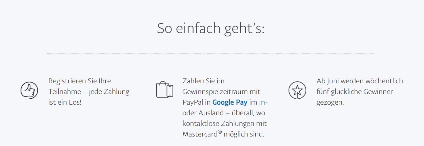 Voraussetzung für die Teilnahme ist Anmeldung zum Gewinnspiel in dem im Punkt 1 genannten Aktionszeitraum.Sie müssen mindestens eine Mastercard® Zahlung im Geschäft mit PayPal in Google Pay im Aktionszeitraum vornehmen. Jede registrierte Transaktion ist ein Los und zählt einmal. Jede weitere Mastercard® Zahlung mit PayPal in Google Pay im Aktionszeitraum ist ein weiteres Los, d.h. eine weitere Teilnahmemöglichkeit und Gewinnchance. Jedes nicht gezogene Los bleibt im „Gewinnspieltopf“ für die späteren Ziehungen. Die Transaktion muss vor der jeweiligen Ziehung erfolgen, damit sie als Los gewertet werden kann.