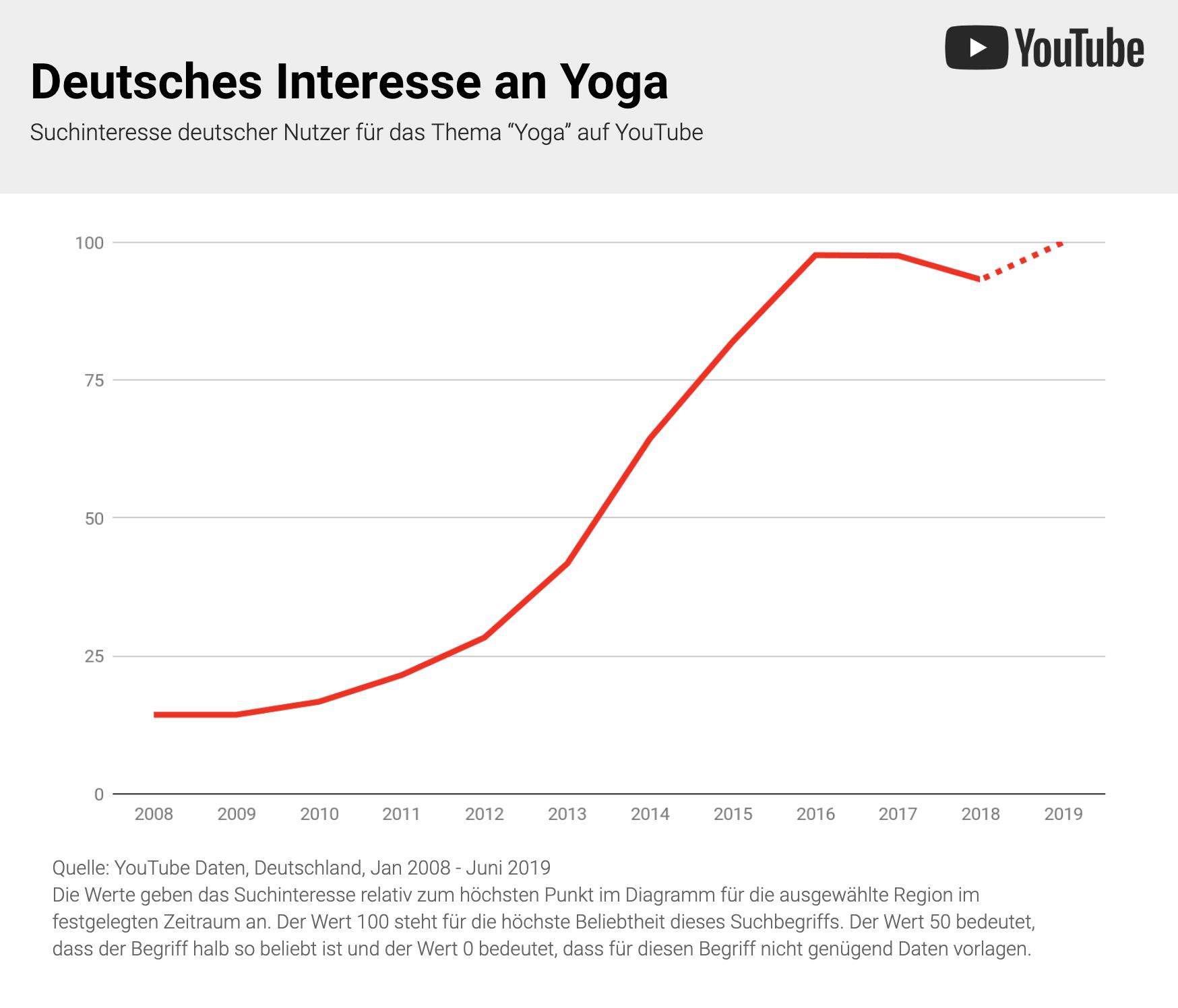 Yoga erfreut sich nicht nur als Sportart und Entspannungsmethode in den Studios großer Beliebtheit, sondern auch in den eigenen Vier Wänden, wo sich viele Menschen vor allem mithilfe von YouTube die besten Übungen zeigen lassen. Seit 2008 ist das Suchinteresse rund um Yoga auf YouTube um 550 Prozent gestiegen und erreichte 2016 seinen ersten Höhepunkt. Auch die aktuellen Daten der YouTube-Trends lassen erahnen, dass der Hype kein Ende nimmt.