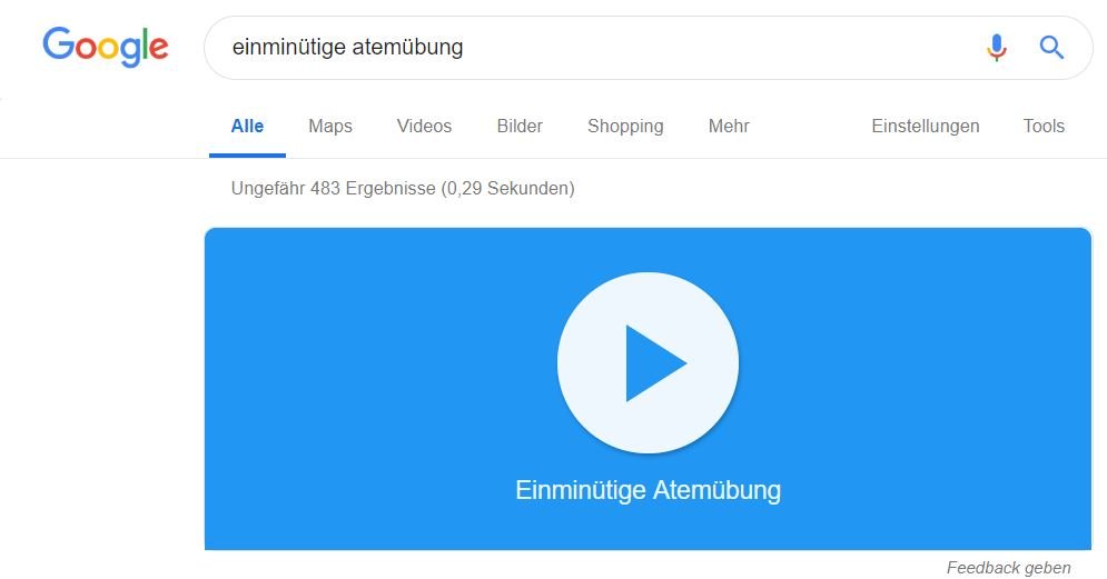 Die Google Websuche kann aber nicht nur Musikern den Takt vorgeben, sondern kann tatsächlich auch mit Atemübungen dienen bzw. zur Meditation angewendet werden. Dazu müsst ihr die Suchanfrage einminütige Atemübung eingeben (nur „Atemübung“ reicht nicht) und schon kann es losgehen. Als einziges Werkzeug gibt es einen großen Play-Button, mit dem das „Richtig atmen lernen“ gestartet wird.