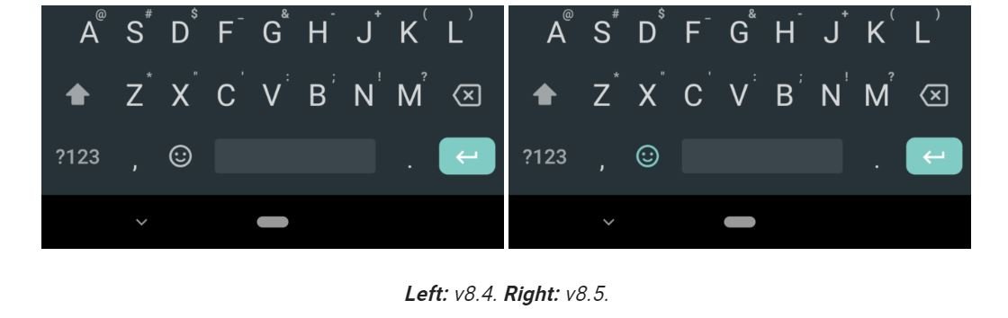 Die zweite sichtbare Veränderung an der Oberfläche, die mit Sicherheit jedem Nutzer während des Alltags ins Auge springt: Die Emoji-Taste ist nun ebenfalls mit der eingestellten Akzentfarbe des ENTER-Buttons hinterlegt und sticht somit etwas stärker als zuletzt hervor. Da sich dahinter bekanntlich viele weitere Späße verstecken, ist das vielleicht als Versuch zu betrachten, die Nutzung der zusätzlichen Medien zu verstärken.