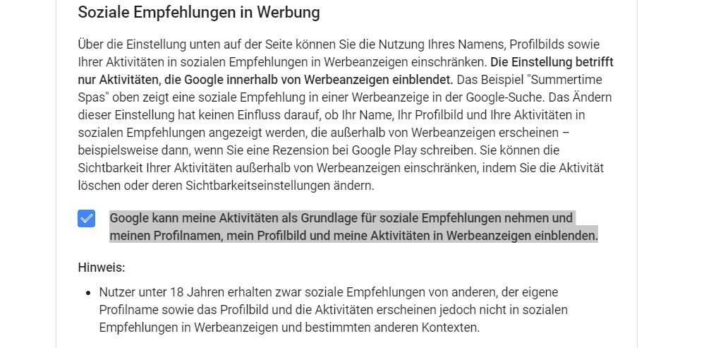 Google kann meine Aktivitäten als Grundlage für soziale Empfehlungen nehmen und meinen Profilnamen, mein Profilbild und meine Aktivitäten in Werbeanzeigen einblenden.