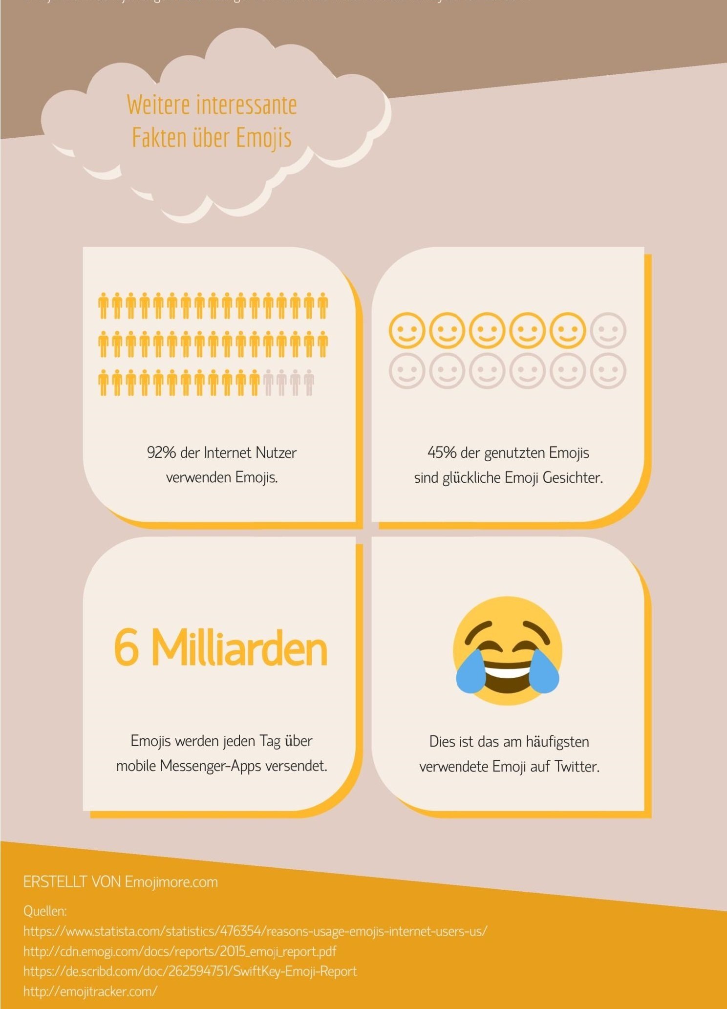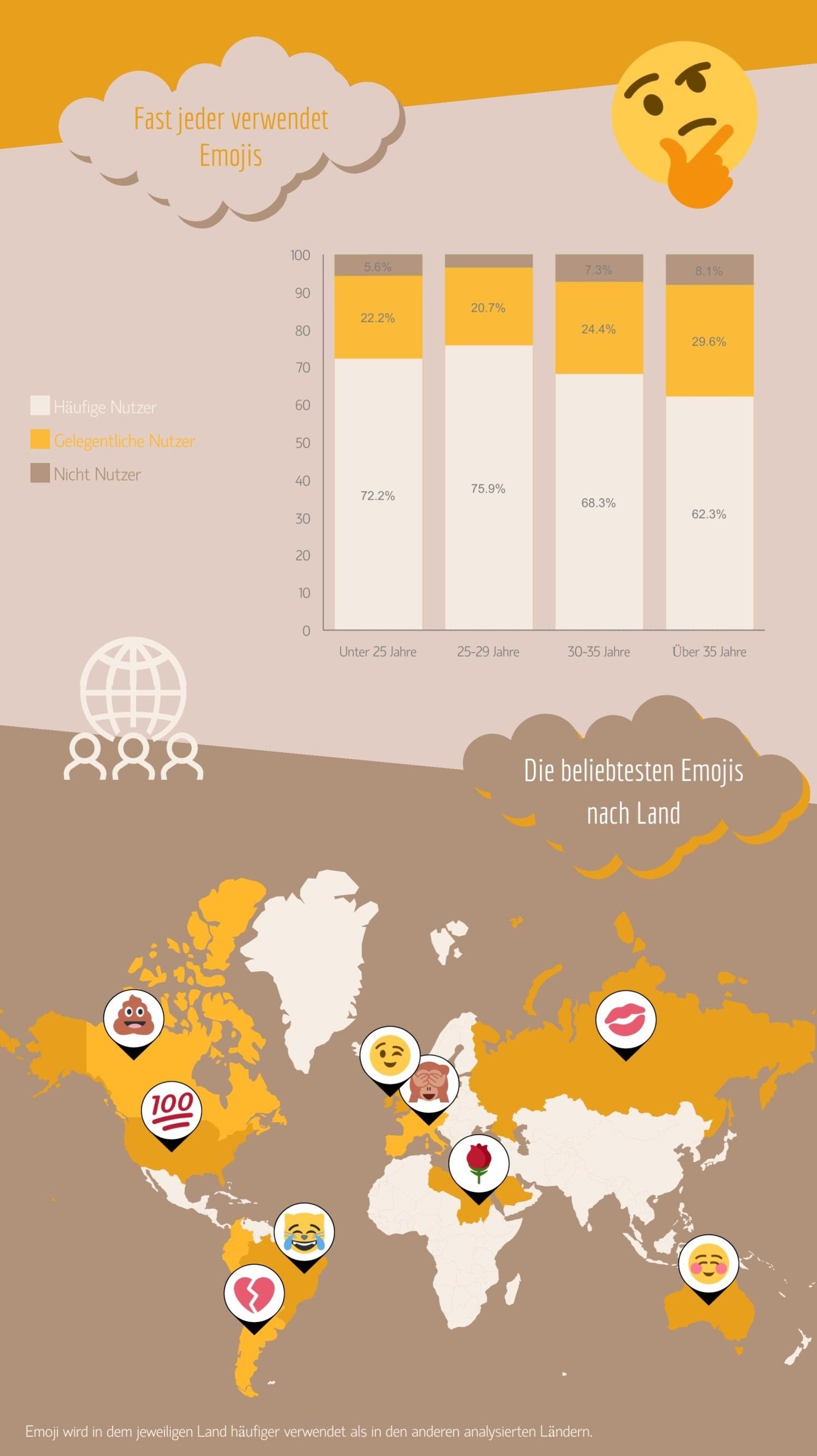 Zwischen 65 und 70 Prozent der Nutzer verwenden die Emojis, um sich besser auszudrücken und Gefühlen stärker Ausdruck zu verleihen bzw. bestimmte Bedeutungen zu unterstreichen. In der folgenden Infografik von Emojimore findet ihr viele weitere interessante Statistiken, wie etwa auch die populärsten Emojis nach Region. Die globale Top 10 findet ihr an dieser Stelle.