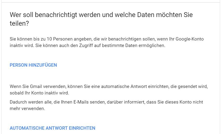 Bis zu 10 Personen können festgelegt werden, die über das nun als inaktiv markierte Konto verfügen können. Auch eine automatische GMail-Antwort lässt sich einrichten.