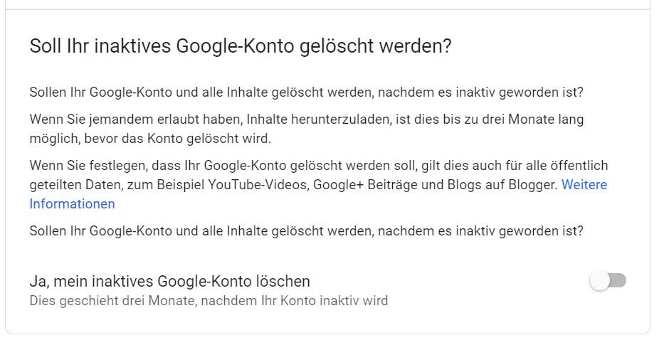Dieser Kontoinaktivität-Manager kann natürlich auch jederzeit wieder deaktiviert werden, sodass ihr alles seinen eigenen Gang gehen lasst – das muss jeder für sich selbst entscheiden. Bitte beachtet aber auch, dass der Zeitraum nicht zu kurz gewählt wird. Ein Beispiel: Nach einem Unfall liegt ihr ein halbes Jahr im Koma und schon sind die Daten weg oder andere Menschen hatten Zugriff darauf. Keine schöne Sache, sollte aber nicht außer Acht gelassen werden. Denkt einfach selbst darüber nach 😉