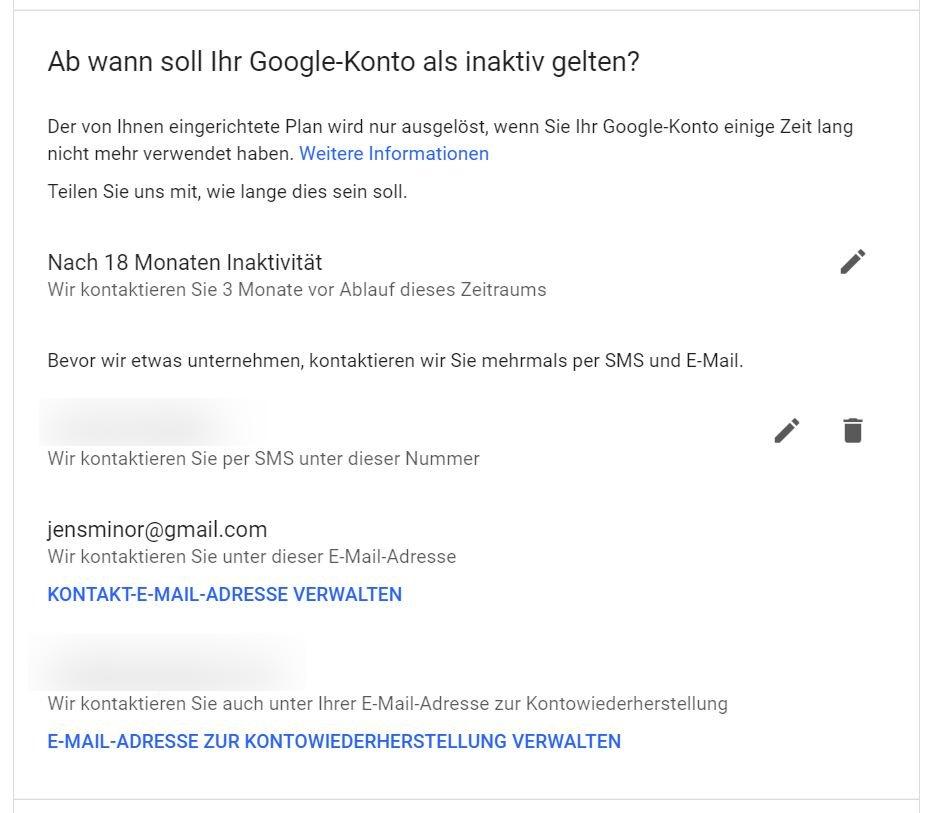 Sie haben festgelegt, was mit Ihrem Google-Konto passieren soll, falls Sie es unerwartet nicht mehr verwenden können, zum Beispiel bei einem Unfall oder im Todesfall. Sie können diese Einstellungen hier jederzeit einsehen, ändern oder deaktivieren.