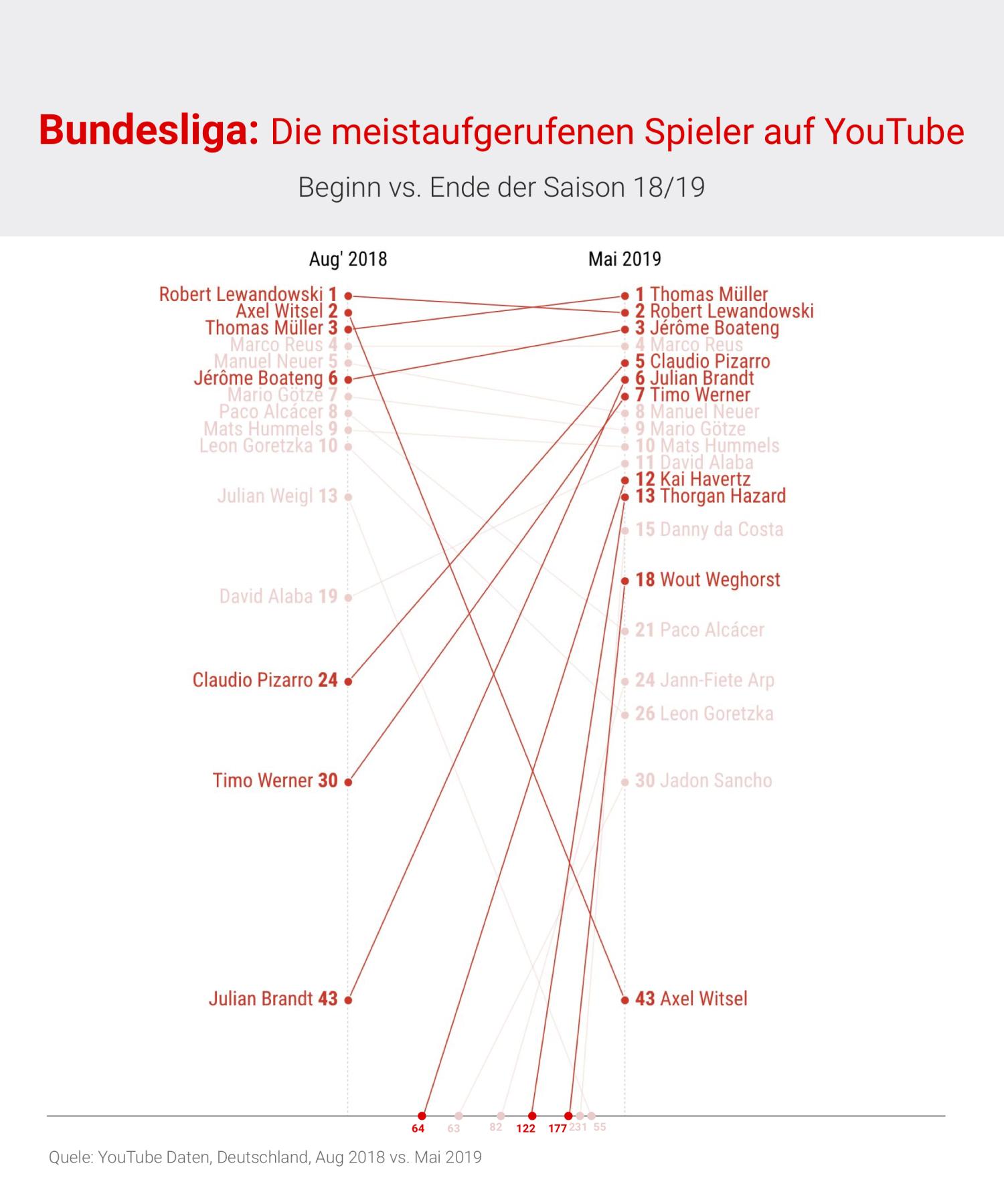 Ob Hertha BSC, VfL Wolfsburg oder Eintracht Frankfurt – unser YouTube Top Trending Team besteht aus Spielern, die einen erheblichen Anstieg an Videoaufrufen verzeichnen konnten, vergleicht man die Aufrufe des letzten mit dem ersten Monat der Bundesliga-Saison 2018/2019: