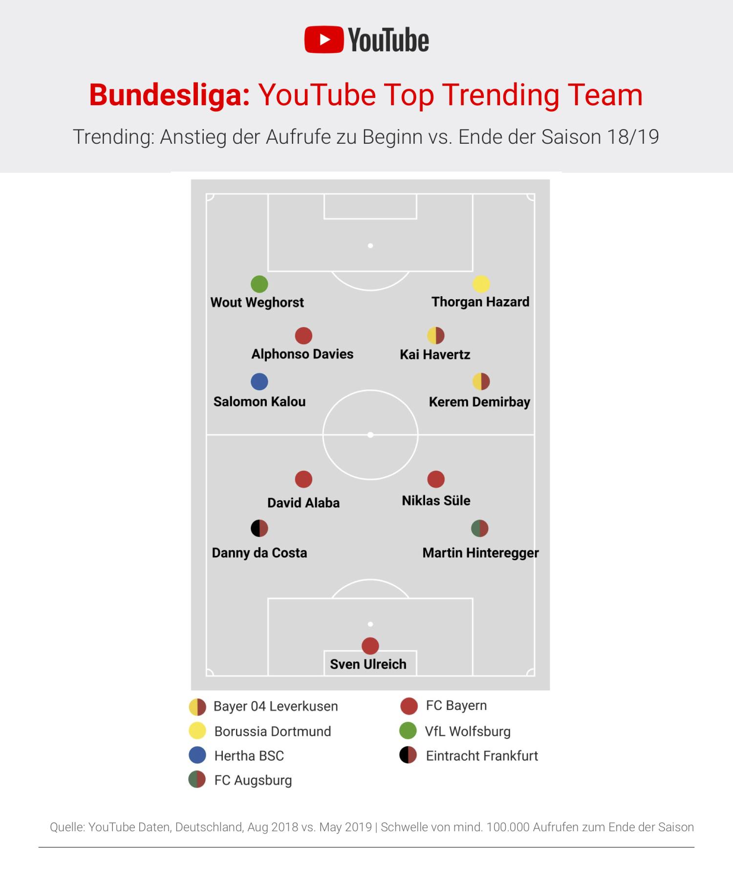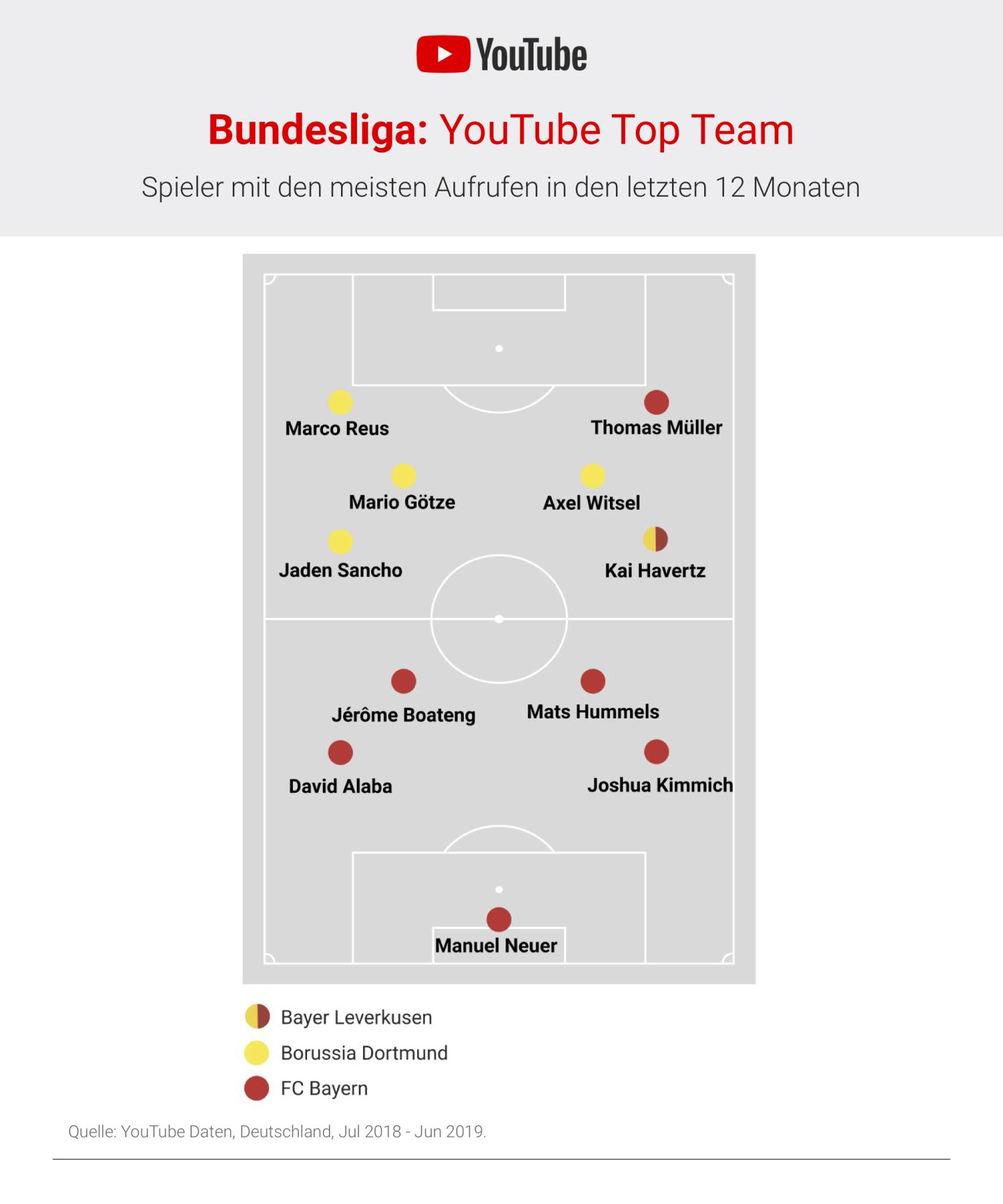 Wir präsentieren das erste „YouTube-Team“. In die Elf haben es die auf YouTube beliebtesten Fußballer der letzten zwölf Monate geschafft. Auch auf YouTube gibt es einen klaren Zweikampf zwischen den deutschen Spitzenteams FC Bayern München und Borussia Dortmund, mit dem Ergebnis 6:4 für die Bayern. Mit eingeschlichen hat sich Kai Havertz von Bayer 04 Leverkusen: