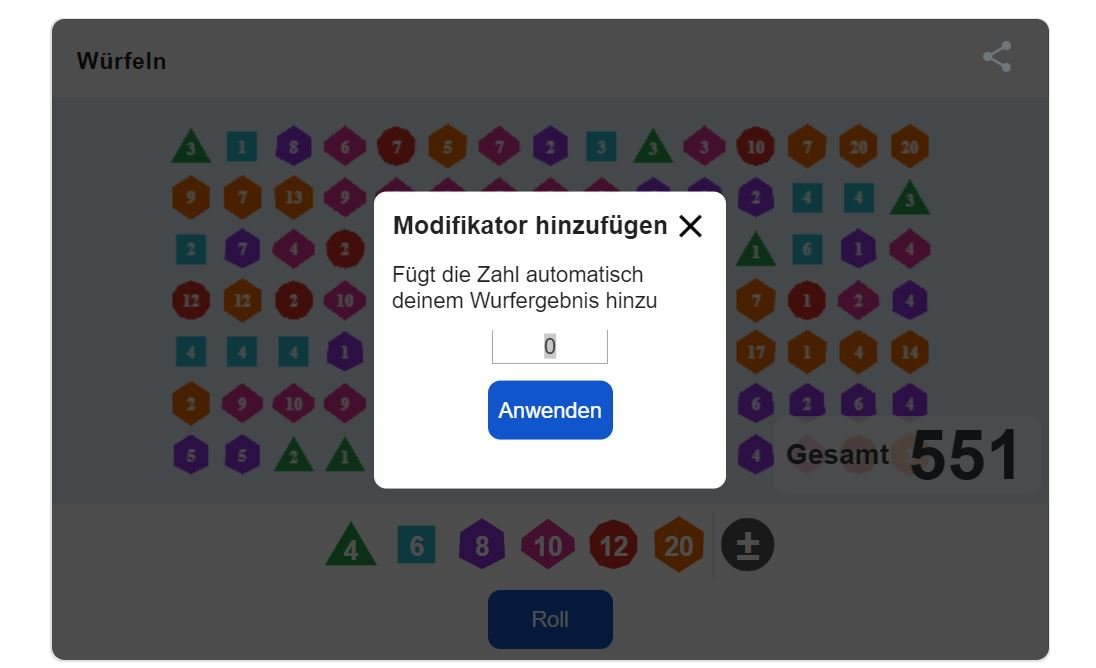 Wer möchte, kann auch noch weiter Einfluss nehmen: Neben den sechs Würfeln besteht die Möglichkeit, eine beliebige definierte Zahl zum Endergebnis hinzuzufügen. Würfelt ihr also eine 5 und eine 6 und fügt noch 8 dazu, erscheint als Summe in der rechten unteren Ecke 19 statt 11. Auch das wird mit einer netten Animation durchgeführt, sodass ihr erst die 11 und kurz darauf die 19 seht. Wirklich praktisch, gerade für Fans von Brettspielen.