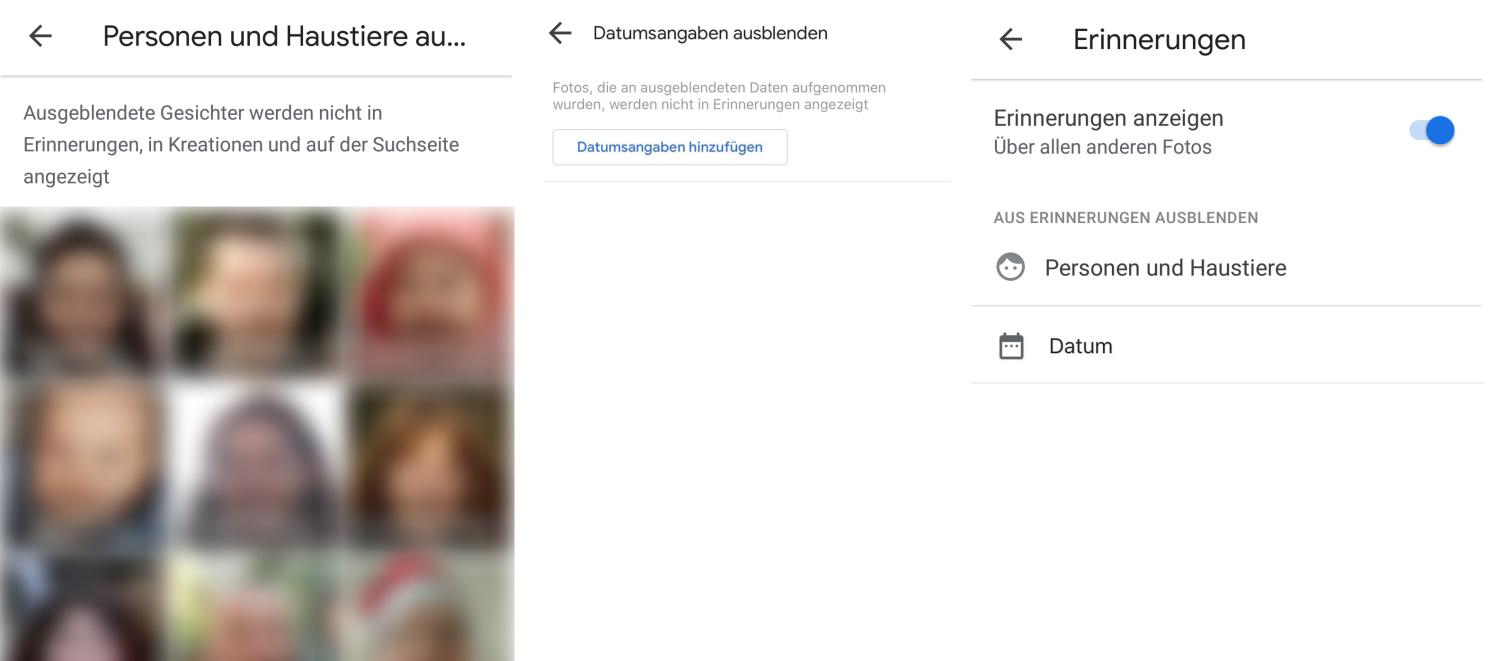 Sobald die Erinnerungen freigeschaltet wurden, gibt es auch in den Einstellungen einen neuen Bereich, in denen ihr einige Optionen rund um diese automatischen Stories festlegen könnt. Als Erstes lässt sich die gesamte Funktion deaktivieren, aber es kann auch sehr einfach festgelegt werden, welche Personen oder Haustiere NICHT in einer Story vorkommen soll. Als zweiter Filter lässt sich festlegen, dass Fotos und Videos von bestimmten Daten nicht verwendet werden sollen. Das ist praktisch, wenn ihr Personen oder Ereignisse ausblenden wollt, an die ihr aus diversen Gründen nicht erinnert werden möchtet.