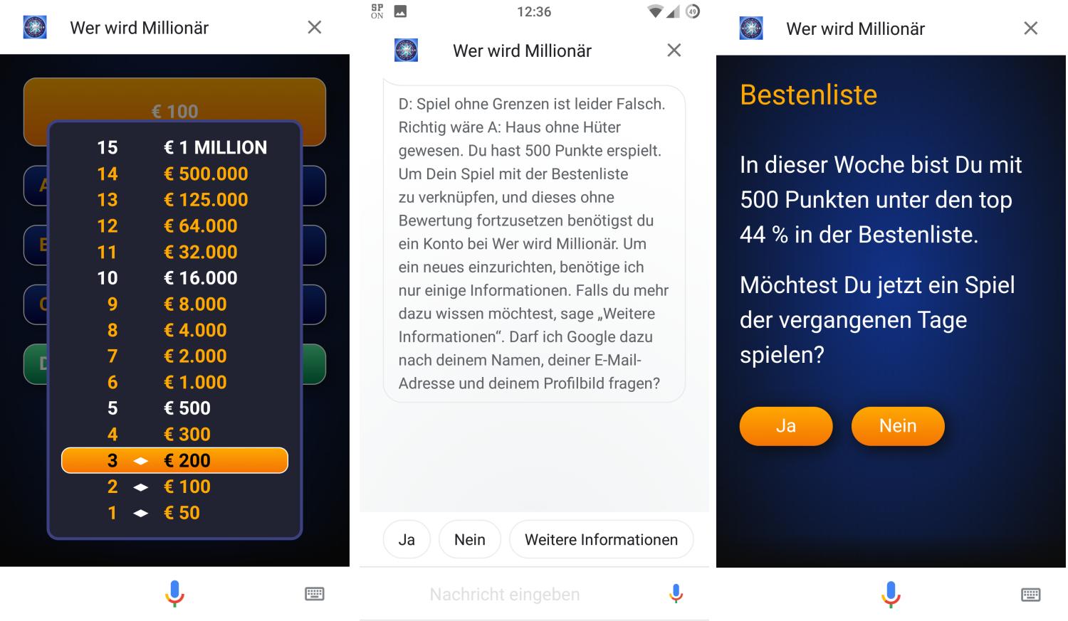 Sagt dem Google Assistant einfach den Befehl „Rede mit Wer wird Millionär“ und schon wird das Spiel gestartet. Nach wenigen Sekunden werdet ihr von den vertrauten Farben der Quizshow begrüßt und könnt mit einem weiteren Touch die Runde beginnen. Alternativ könnt ihr euch die Bestenliste ansehen, auf die ihr nach erfolgreicher Registrierung ebenfalls eingetragen werden könnt. Die Registrierung läuft sehr einfach über zwei Fragen im Google Assistant ab, der euren Namen und Profilbild für die App freigibt.