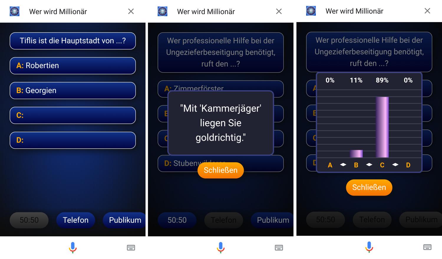 In meinen ersten Spielrunden würde ich die Qualität und Schwierigkeit der Fragen mit denen aus dem TV vergleichen. Wie sich das langfristig entwickelt, wird sich zeigen müssen und dürfte wohl auch vom Erfolg des Spiels abhängen. Ich gehe aber davon aus, dass die Fragen aus dem großen Pool der letzten 20 Jahre der TV-Show stammen und keine eigene Fragen-Redaktion für dieses Spiel beschäftigt wird. Die Fragen werden speziell für die Umsetzung mit dem Assistant aufbereitet. Immerhin ist das Spiel kostenlos und werbefrei.