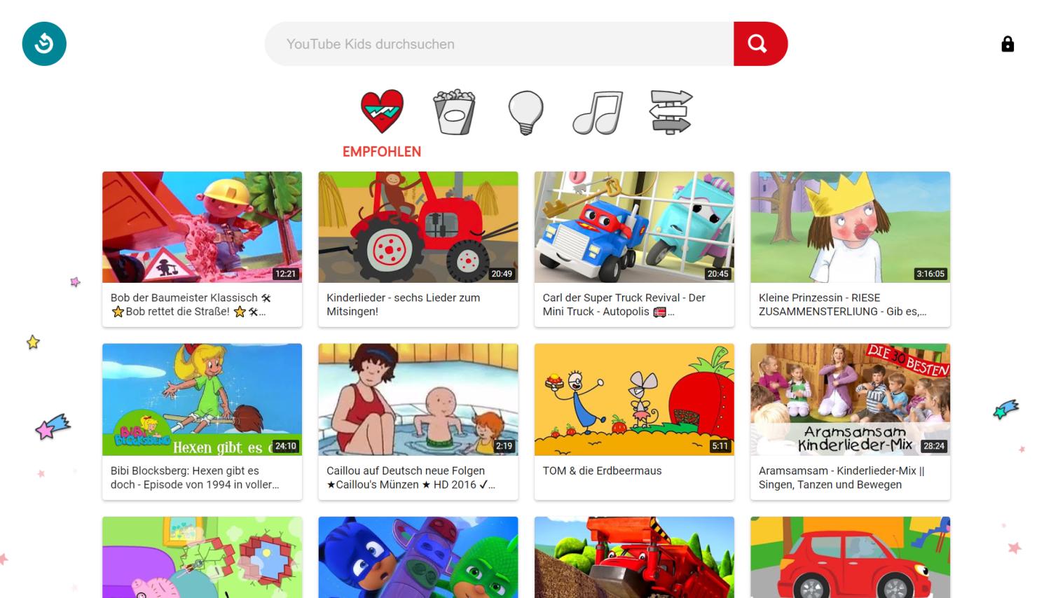 - In der Altersstufe „Jünger (5–7 Jahre)“ können Kinder Inhalte rund um ihre Interessen entdecken und nach Videos zu Themen wie Musik, Cartoons oder Basteln suchen.