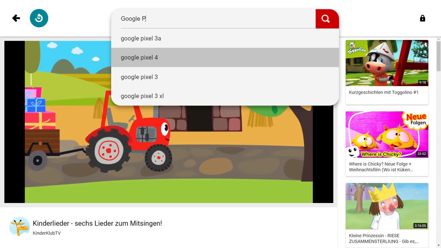 Wenn die Eltern es freischalten, gibt es auch eine Suchfunktion, die allerdings sehr merkwürdig arbeitet. Es gibt eine automatische Vervollständigung, die zwar keine für Kinder ungeeigneten Begriffe enthält (zumindest ist mir nichts aufgefallen), aber sehr viele harmlose Vorschläge macht, die auf der Plattform nicht zu finden sind. Gibt man „Google“ ein, findet man sehr ähnliche Vorschläge wie auf der großen Videoplattform – etwa zu den Pixel-Smartphones. Sucht man dann danach, finden sich aber doch wieder nur Kindervideos, die mit den Suchbegriffen absolut nichts zu tun haben.