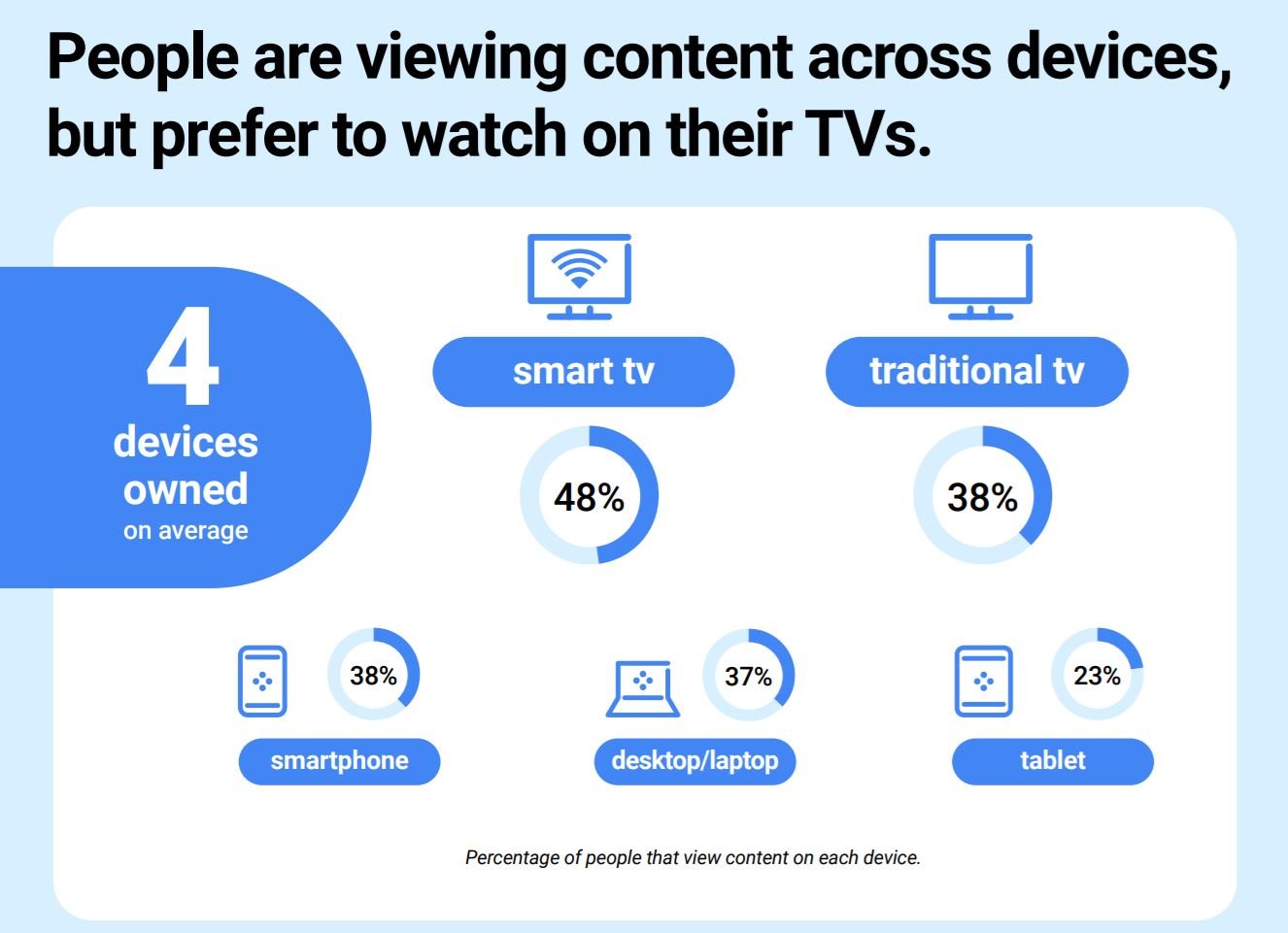 Im Durchschnitt besitzt jeder Nutzer mittlerweile vier Geräte, auf denen Filme abgespielt werden können. Jeder zweite präferiert dabei wenig überraschend den Smart TV und 38 Prozent nutzen den traditionellen Fernseher. Der Unterschied zwischen diesen beiden Punkten dürfte einfach daran liegen, dass die befragten Personen das jeweilige Gerät besitzen. Das Smartphone ist mit dem Fernseher gleichauf, sehr knapp gefolgt vom Laptop und erst letzter Stelle kommt das Tablet mit nur 23 Prozent. Das ist eine kleine Überraschung.