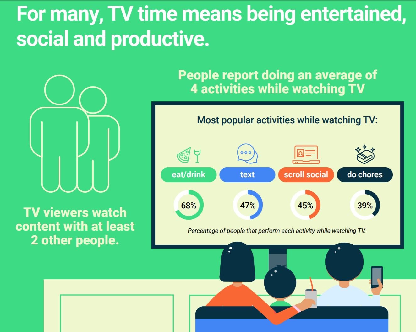 Nur die wenigsten Menschen schauen alleine Fernsehen, sondern sind mindestens zu zweit und erledigen nebenbei nicht weniger als vier Aufgaben. Zu diesen Aufgaben gehören Essen und Trinken, Messenger, Social Networks oder Hausaufgaben erledigen. Das zeigt auch, dass nur wenige Menschen sich zu Hause komplett stumm und ohne Nebenbeschäftigung berieseln lassen, so wie das etwa im Kino üblich ist bzw. sein sollte.