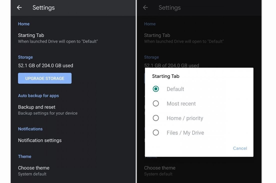 Google Drive wird den Nutzern schon bald die Möglichkeit geben, die beim Start der App verwendete Oberfläche festzulegen. Dafür gibt es in den Einstellungen den neuen Punkt Starting Tab, in dem entweder die bekannte und standardmäßige verwendete Ansicht verwendet werden oder aus drei weiteren Optionen gewählt werden kann. Dazu gehören die Auflistung der zuletzt bearbeiteten Dateien, die Startseite mit den wichtigen Dateien oder die klassische Ordneransicht.