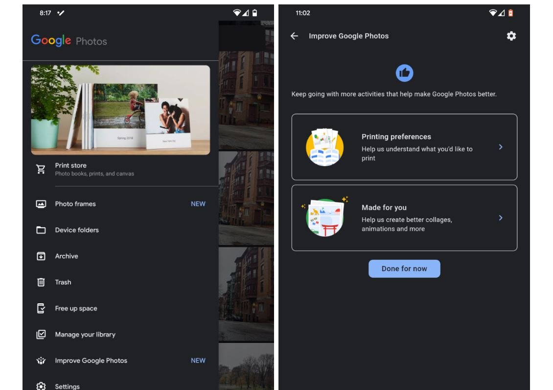 Wie ihr auf obigem Screenshot erkennen könnt, gibt es in der Google Fotos-App bei vielen Nutzern nun einen Bereich zum Verbessern von Google Fotos. Dort finden sich aktuell zwei Einträge, zumindest bei dem Konto dieser Person. Ein Assistent fragt nach den Vorlieben zum Ausdrucken von Bildern und der andere nach den automatisch erstellten Vorschlägen. Die Antworten sollen sowohl Einfluss auf zukünftige Vorschläge im eigenen Konto als auch global für alle Nutzer haben.
