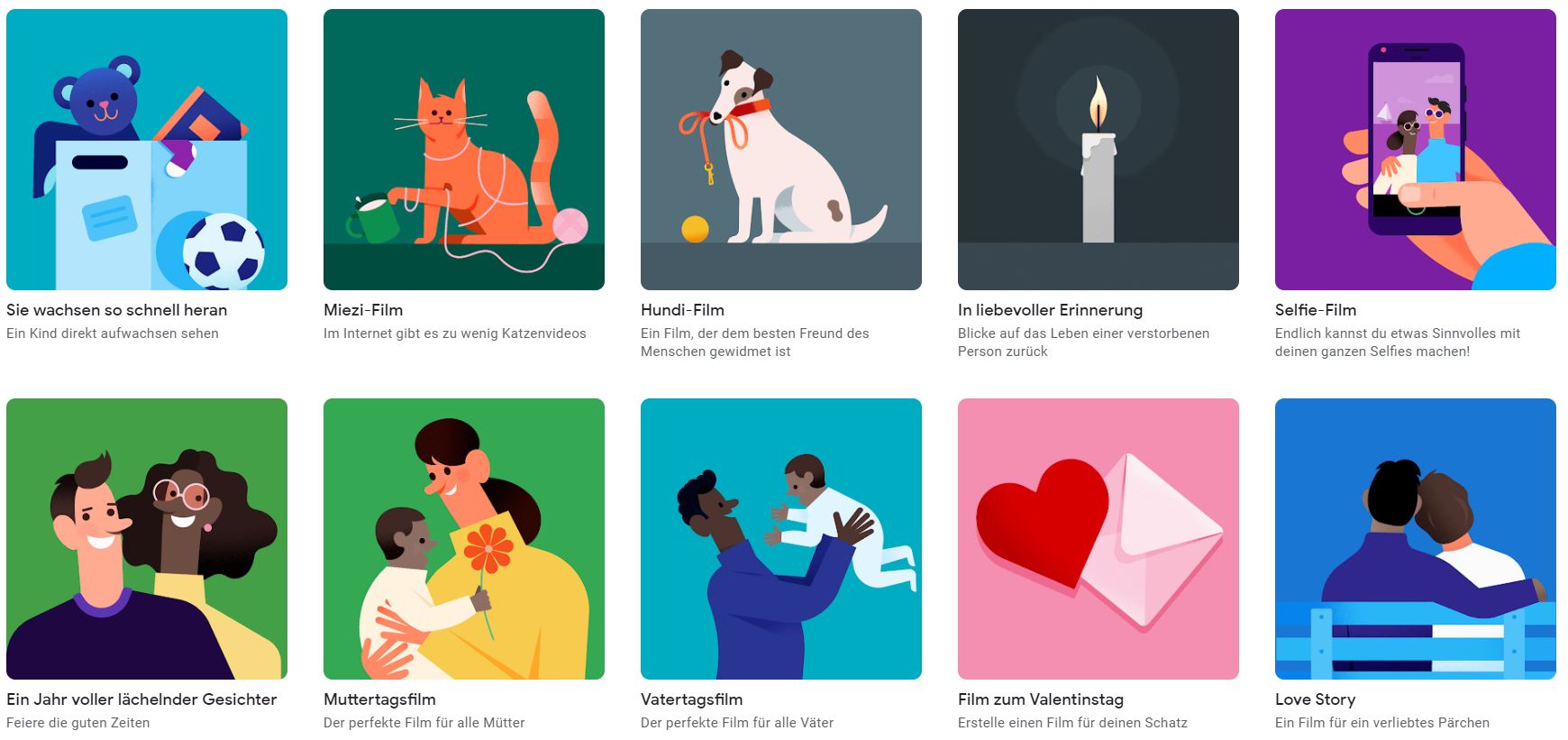 Soll es ein digitales Geschenk oder einfach ein lieber Weihnachtsgruß werden, kann Google Fotos ebenfalls helfen. Der integrierte Video-Assistent gibt euch die Möglichkeit, aus zehn verschiedenen Vorlagen auszuwählen und einen Film für und über eine oder mehrere Personen zu erstellen. Schaut euch die Auswahl (Screenshot oben) einfach einmal an und entscheidet euch für einen passenden Film. Rückblick auf das gesamte Jahr? Die glücklichsten Momente? Das Aufwachsen von Kindern oder ein Film über das Haustier? Alles mit nur wenigen Klicks möglich.