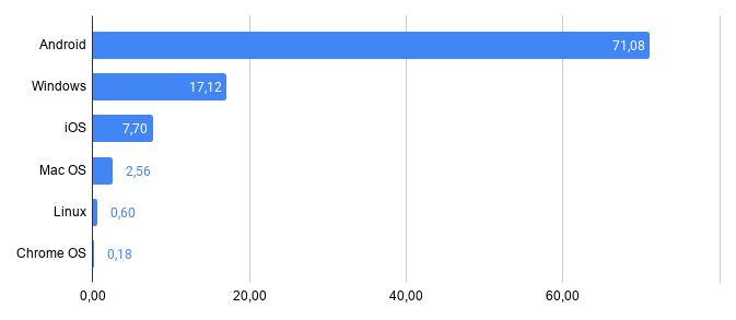 Wenig überraschend ist Android auch bei uns im Blog das dominierende Betriebssystem, denn die meisten Menschen surfen eben am Smartphone und da wiederum dominiert Android. Die grob gerundete 90/10-Verteilung zwischen Android und iOS ist auch bei unseren Besuchern ablesbar. Aber schauen wir auf Chrome OS. Googles Desktop- und Tablet-Betriebssystem kommt nur auf 0,18 Prozent. Und das bei unserer Zielgruppe, in der kaum Nutzer zu finden sein dürften, die keine Google-Produkte nutzen wollen.