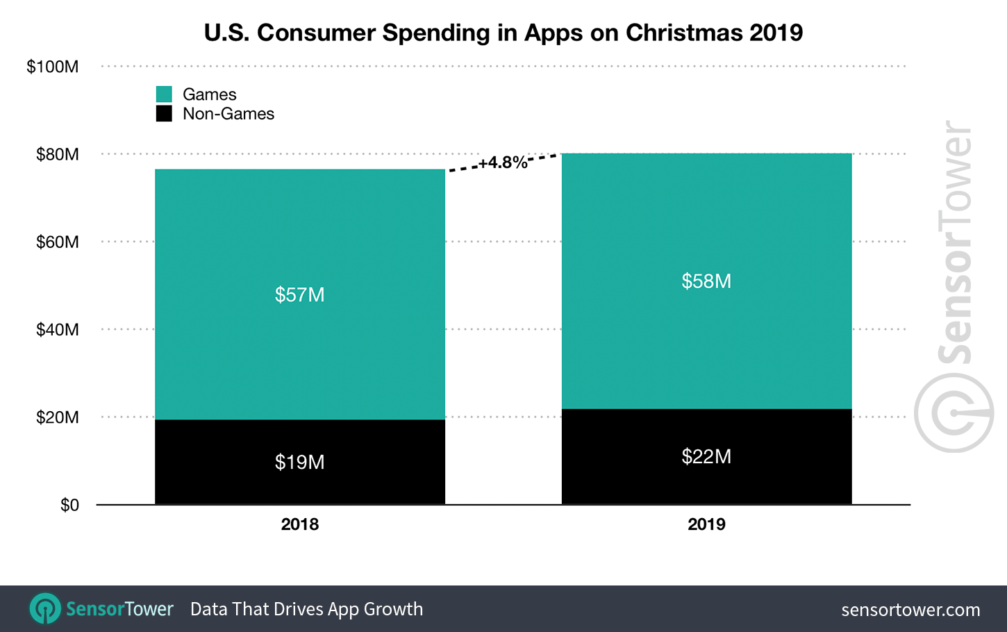 Zu Weihnachten steigen die Umsätze, das gilt in fast allen Branchen und trifft auch auf die App Stores zu. Apple und Google konnten allein im Dezember 2019 einen Umsatz von 5,1 Milliarden Dollar erwirtschaften – das entspricht nach 4,7 Milliarden Dollar im Vorjahr einer Steigerung von gut acht Prozent. In den Grafiken und der Betrachtung hier im Artikel geht es aber vor allem um den Weihnachtstag, also den 25. Dezember. Wenn von „Weihnachten“ die Rede ist, ist nur dieser eine Tag gemeint.