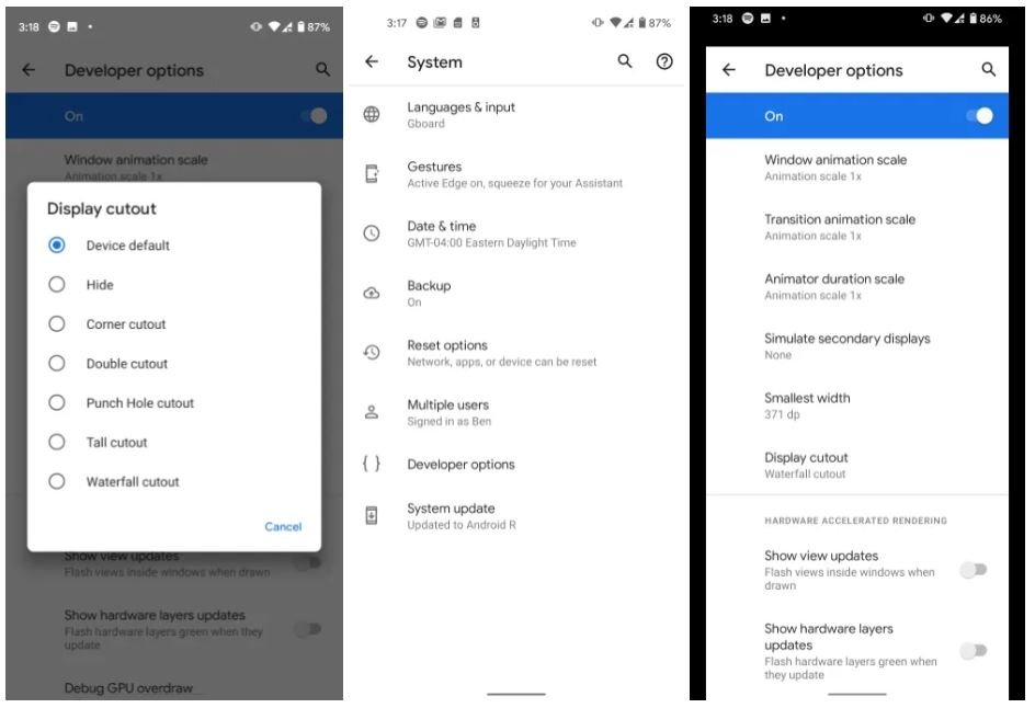 Moderne Smartphones bringen immer mehr Besonderheiten beim Display mit, die nun auch in den Entwicklereinstellungen von Android simuliert werden können. Dazu gehört das Kameraloch, das doppelte Kameraloch, Aussparungen sowie das Wasserfall-Display. Notwendig ist das zum Testen von Apps, kann aber auch zum anfertigen von Screenshots auf solchen Displays verwendet werden.