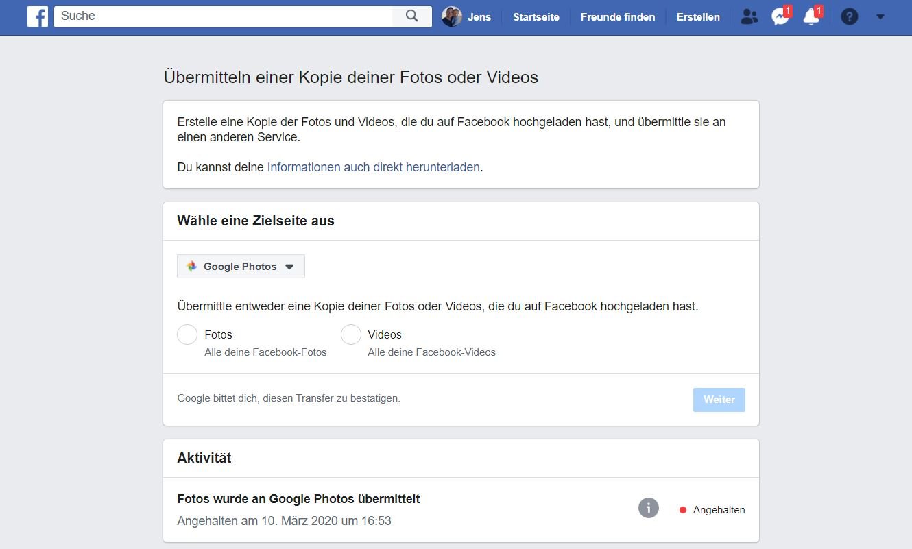 Ruft einfach diese Seite auf, die euch direkt zu den Einstellungen von Facebook führt. Auf der Seite „Übermitteln einer Kopie deiner Fotos oder Videos“ wählt ihr zuerst das Ziel der Übertragung aus, wobei die Wahl mit nur einem einzigen Eintrag derzeit nicht wirklich schwer fällt. Anschließend wählt ihr noch aus, ob alle Fotos oder Videos übertragen werden und schon ist eure Arbeit für die Übertragung getan.