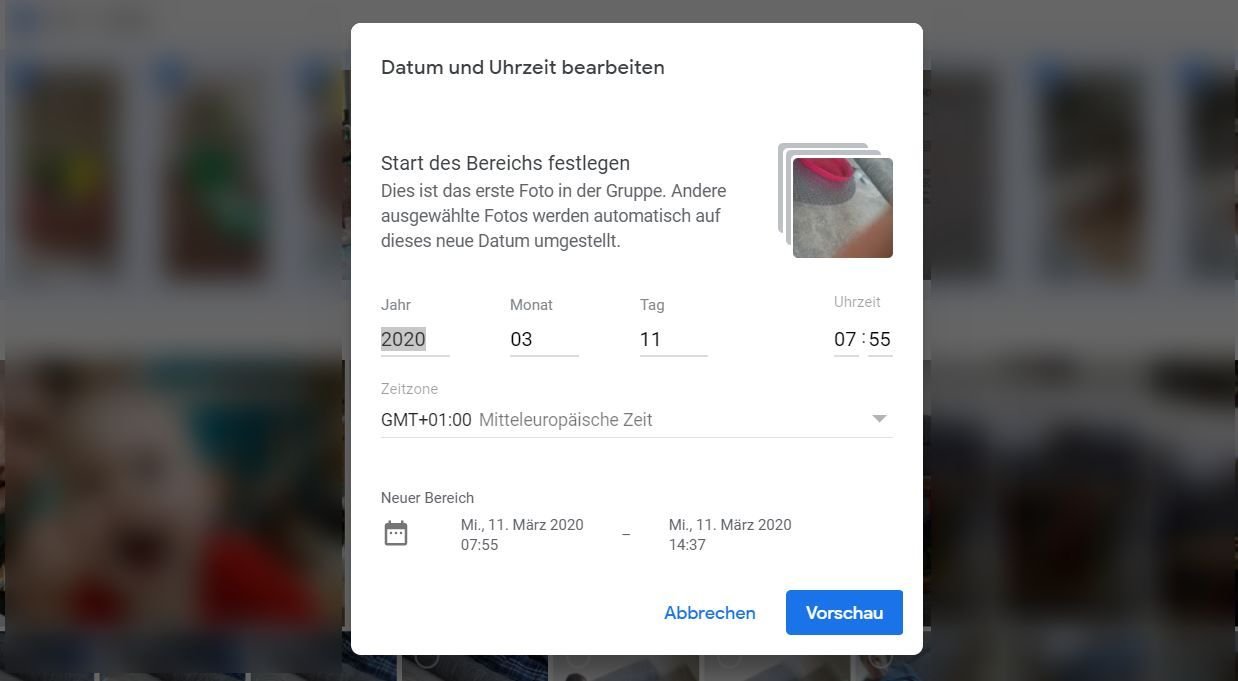 - Jetzt seht ihr ein Vorschaubild, das als Ausgangspunkt verwendet wird. Gebt das korrekte Datum und Uhrzeit für dieses Foto ein.