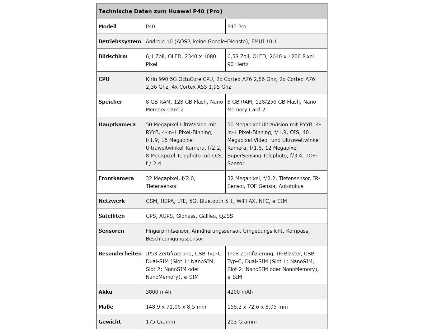 Huawei wird heute das lang erwartete Huawei P40 vorstellen, das die Nachfolge des erfolgreichen Huawei P30 antreten soll. Natürlich sind im Vorfeld wieder alle Spezifikationen und auch zahlreiche Bilder sowie die Preisgestaltung durchgesickert, die ihr an vielen Stellen im Web finden könnt. In folgender Tabelle findet ihr alle wichtigen Spezifikationen des P40 und P40 Pro. Viele weitere Informationen erhaltet ihr bei WinFuture.