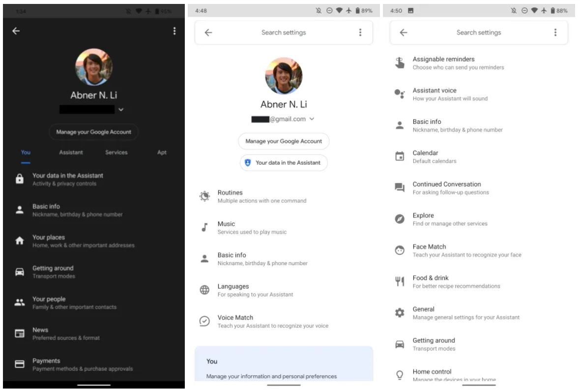 Auf obigem Screenshot seht ihr links die alte Oberfläche und auf den beiden weiteren Screenshots die neue Oberfläche. Das Profil ist an Ort und Stelle geblieben, darunter gibt es nun zusätzlich eine Verknüpfung zu den gespeicherten persönlichen Daten im Google Assistant. Anschließend gibt es nun keine Tabs mehr, sondern alle Einstellungsmöglichkeiten finden sich in einer langen Liste wieder, die durch Zusammenfassungen und neue Unterkategorien zwar immer noch sehr lang, aber dennoch logisch angeordnet und übersichtlich ist. Beachtet, dass zuerst die allgemeinen Optionen und dann der „YOU“-Bereich folgt.