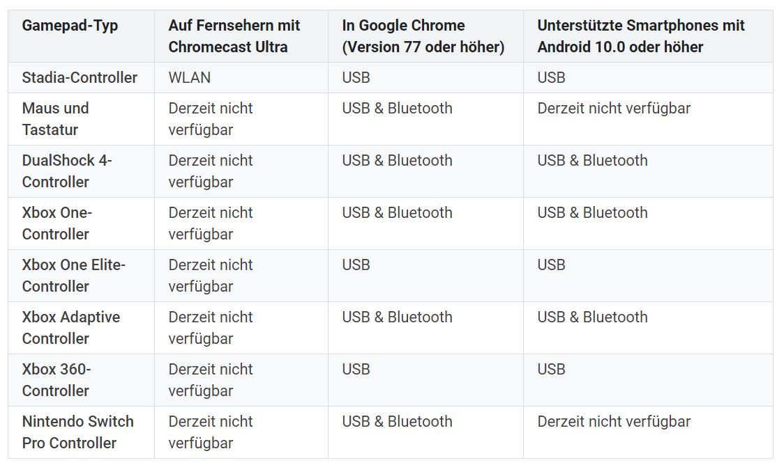 Wie aus obiger Tabelle hervorgeht, lässt sich Stadia auch mit aktuellen Controllern der Xbox, PlayStation sowie Nintendo Switch spielen. Dabei geht es natürlich nicht nur um die technische Kompatibilität, sondern auch um das grundlegende Controller-Design und die verfügbaren Eingabemethoden – und in diesen Punkten sind sich alle Konsolen eben ähnlich.