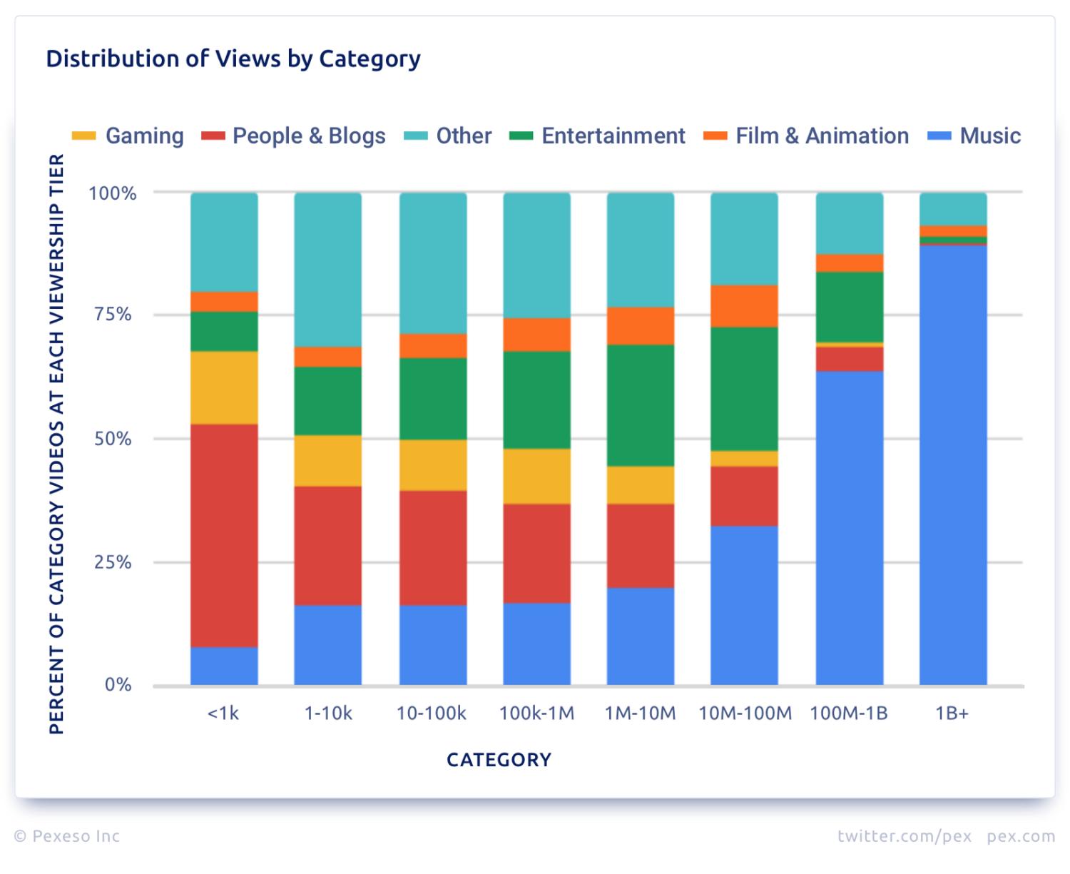 Spielt man diese Statistik etwas weiter, wird die Zahl noch extremer: Fast 97 Prozent aller Videos haben weniger 10.000 Aufrufe und nur 0,64 Prozent aller Videos erreichen überhaupt die Marke von 100.000 Aufrufen. In den größeren Sphären wird es dann nochmal interessant: Gerundet erreichen 0,0 Prozent aller Videos die Marke von 10 Millionen Aufrufen. Wenn man die vielen großen YouTuber und Stars mit ihren Massenvideos bedenkt, zeigt sich an dieser gerundeten Nicht-Existenz, wie groß die Auswahl der Videos auf der Videoplattform wirklich ist.