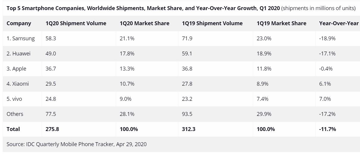 IDC sieht den Markt um 11,7 Prozent einbrechen, wobei vor allem Samsung und Huawei viele Federn lassen mussten, während Apple nahezu stabil geblieben ist. Xiaomi und Vivo konnten sogar zulegen, aber längst nicht so deutlich wie in den vorherigen Quartalen. Das ist erstaunlich, denn bekanntlich wurde der chinesische Markt im Januar und Februar nahezu vollständig heruntergefahren, während der Rest der Welt etwa seit März im regional sehr unterschiedlichen Shutdown ist. Die großen Auswirkungen dürften vor allem im zweiten Quartal zu spüren sein.