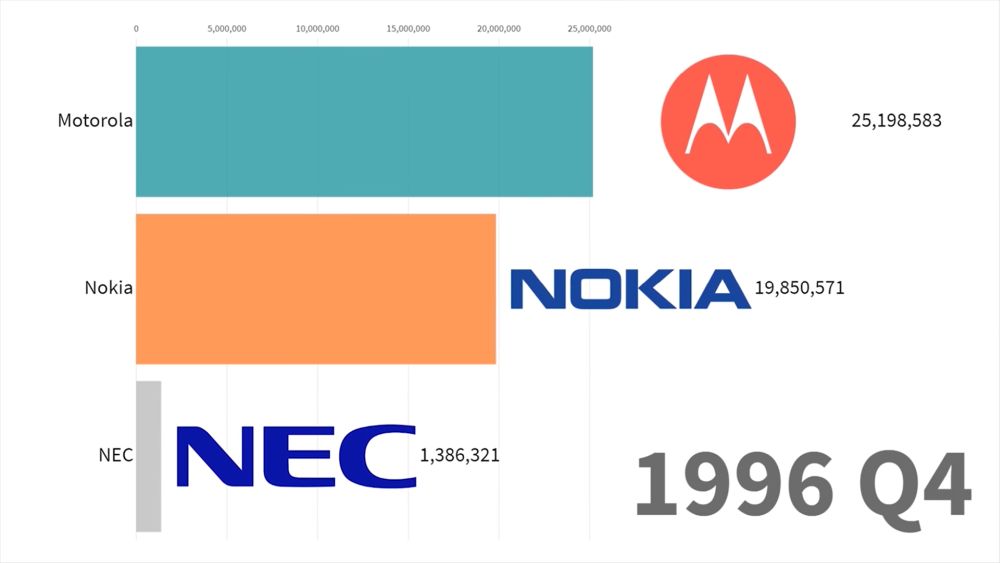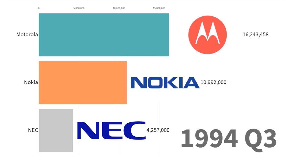 Dieses Dreigespann blieb auch in den folgenden zwei Jahren an der Spitze und Nokia rückte dem Pionier Motorola auf die Pelle, während NEC sich in den folgenden Monaten von der Bildfläche verabschieden wird.