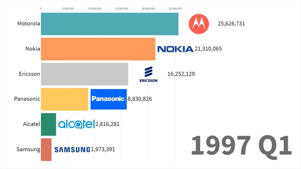 Anfang 1997, es war die erste Boomzeit der Handys, kamen viele neue Marken in die Topliste dazu: Ericsson war damals eine sehr große und populäre Handymarke, Alcatel vor allem in Europa und sogar Panasonic hat mal eigene Handys gebaut. Außerdem erster Auftritt von Samsung, das die Topliste in den nächsten 23 Jahren (und mit hoher Sicherheit auch darüber hinaus) nicht mehr verlassen wird.