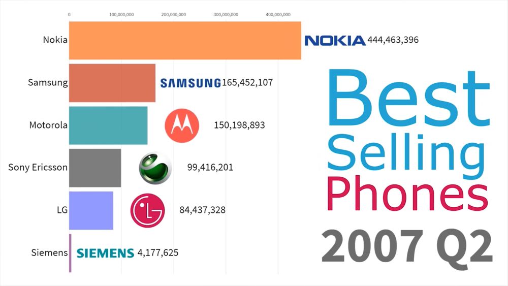 Wir machen einen sehr großen Sprung an den Anfang vom Ende der Handy-Ära, denn Apple hat gerade eben das iPhone vorgestellt und Android ist nur noch wenige Monate entfernt. Nokia hat einen so großen Vorsprung auf den Zweitplatzierten, den nie wieder ein Hersteller erreichen sollte, zumindest bis heute. Aus Ericsson ist Sony Ericsson geworden (später nur noch Sony), LG ist in die Topliste eingestiegen und Siemens verabschiedet sich pünktlich zum Smartphone-Boom aus dem Geschäft.