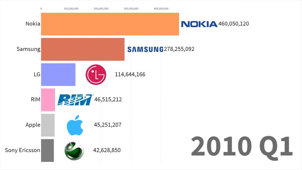 Kleine Überraschung: Es dauerte ganze drei Jahre, bis Apple in der Topliste auftaucht. Samsung und LG haben als erste große Android-Partner sehr stark zugelegt und auch RIM (Blackberry) hatte damals vergleichsweise hohe Marktanteile.