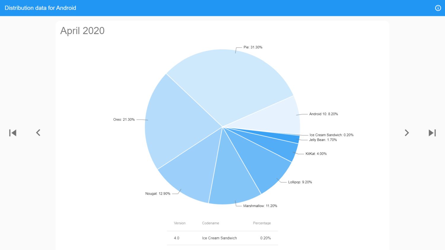 Eine neue Webseite hat es sich nun zur Aufgabe gemacht, die zur Verfügung stehenden Zahlen rund um die Android-Verteilung aufzubereiten und in übersichtlicher Form anzubieten. androiddistribution.io visualisiert alle Zahlen im bekannten Kuchendiagramm inklusive einer darunter liegenden Tabelle mit den Prozentzahlen in tabellarischer Form – das war dann auch schon alles. Mit den Pfeilen an den Rändern lässt sich zum Vormonat oder folgenden Monat wechseln, um die Entwicklung beobachten zu können.