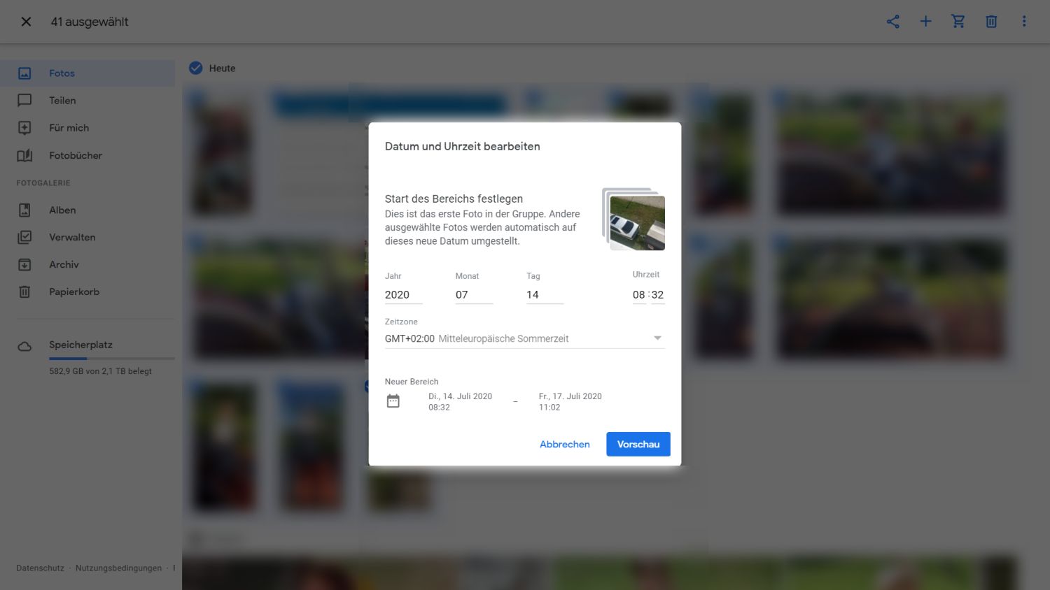 - Zur Kontrolle seht ihr unten im Dialogfeld, welchen Zeitraum alle markierten Fotos nach der Bearbeitung abdecken.
