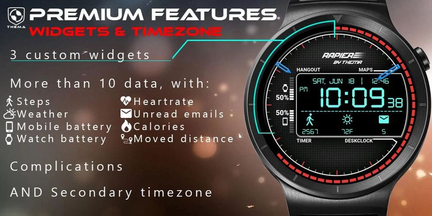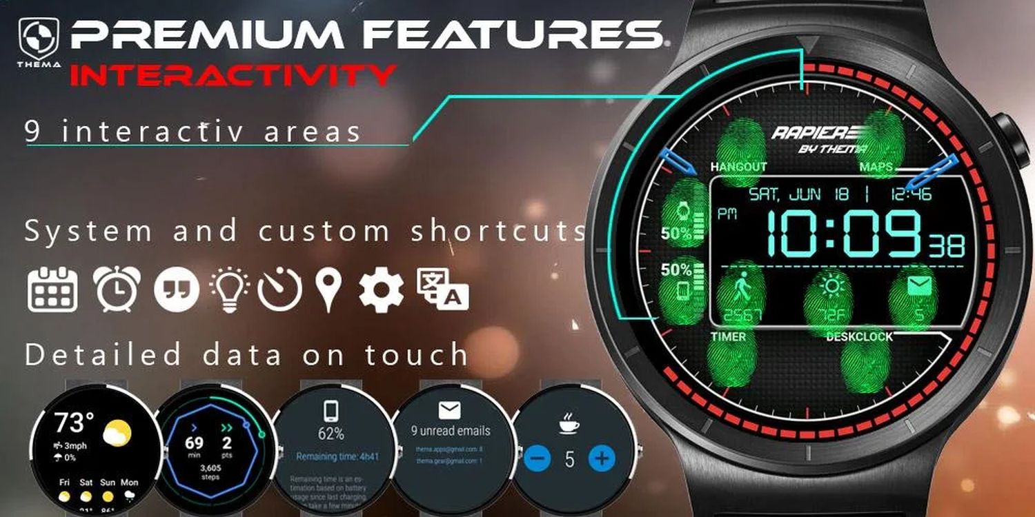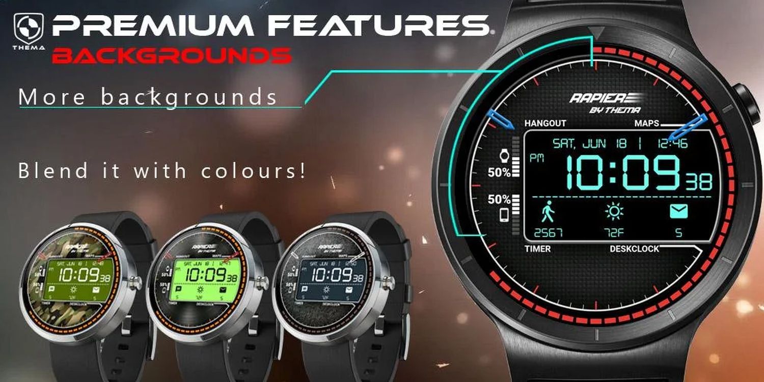 Das Watch Face Rapier sieht schon auf den ersten Blick absichtlich vollkommen überladen aus, auch wenn es nicht unbedingt mehr Informationen darstellt als vergleichbare Watch Faces. Wir sehen die Uhrzeit im damals klassischen digitalen Format, natürlich inklusive Sekundenanzeige. Darunter gibt es einen Schrittzähler, das aktuelle Wetter sowie die Anzahl der aktiven und noch nicht gelesenen Benachrichtigungen. Das ist dann auch schon der visualisierte Displayteil.