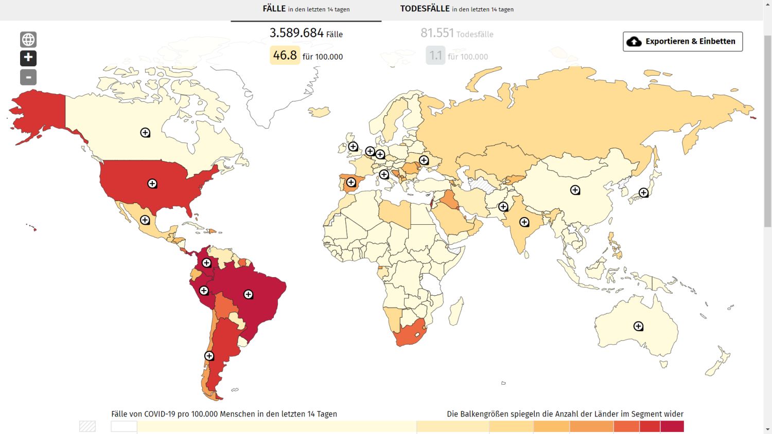Zur einfachen Vergleichbarkeit gibt es eine farbige Skala, die sehr deutlich zeigt, dass große Teile von Europa derzeit sehr gut dastehen und die harten Maßnahmen in den Ländern Wirkung gezeigt haben. Die knallroten USA sowie große Teile Südamerikas zeigen die Auswirkungen der Pandemie, wenn man es zu lange nicht ernst genommen hat oder dies noch immer nicht tut. Nur mal zum Vergleich: In den USA gibt es 234 Todesfälle pro 100.000 Einwohner. In Deutschland sind es 0,1. Dazu muss man wohl nicht mehr viel sagen.