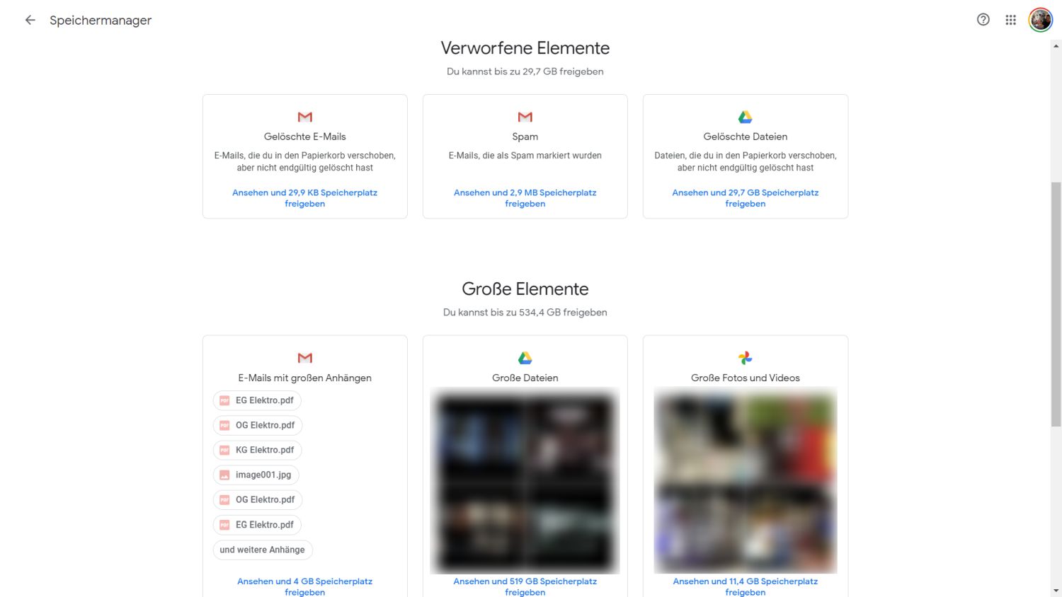 Auf der Seite der Google One Speicherplatzverwaltung seht ihr eine Reihe von in der Cloud gespeicherten Dateien, die ihr möglicherweise nicht mehr benötigt oder euer Kontingent stark belasten. Dort finden sich unter den „verworfenen Elementen“ alle Dateien in den Papierkörben von GMail, Drive und Fotos oder auch die bei GMail im Spam-Ordner befindlichen Dateien. In der nächsten Kategorie findet ihr die „großen Elemente“ aus diesen drei Produkten, die praktischerweise nach Größe sortiert sind.