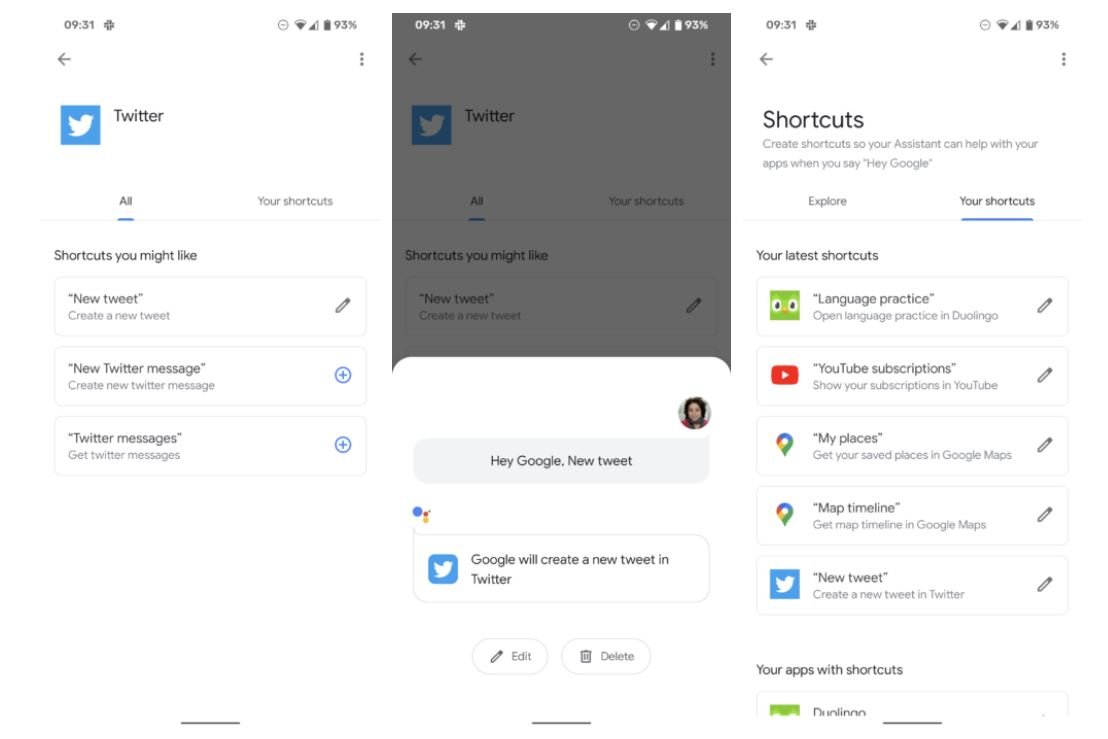Bei den Shortcuts handelt es sich lediglich um Verknüpfungen zu tiefen App-Funktionen, die mit einer kurzen Nachricht ausgelöst werden können: Als Beispiel seht ihr auf obigem Screenshot „New tweet“, was automatisch die Twitter-App mit der Eingabemaske zum Zwitschern öffnet. Die Verknüpfungen sind den Routinen grundsätzlich sehr ähnlich und können als Routine mit nur einer Aufgabe gesehen werden. Diese Verknüpfungen sind mit vielen Apps nutzbar, müssen aber von diesen unterstützt werden und sind daher längst nicht mit allen kompatibel.