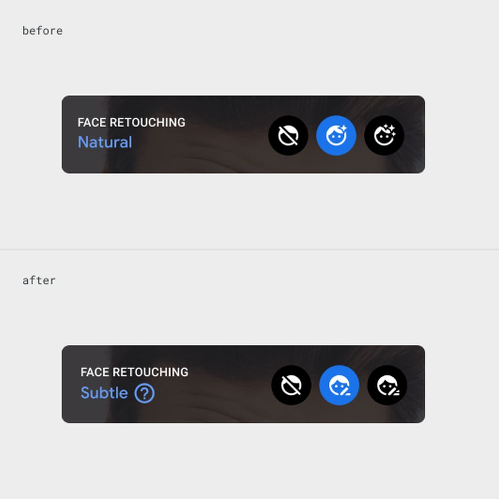 Außerdem sollen die Icons zur Bearbeitung durch neutrale Symbole ersetzt werden und nicht mehr die Werte „Natur“ oder „Schön“ suggerieren, sondern einfach zeigen, dass die Darstellung des Gesichts bearbeitet wird – ohne jegliche Wertung. Ist ein solcher Filter aktiviert, soll dies außerdem dauerhaft im Kamerabild eingeblendet sein. Auf folgenden Screenshots seht ihr, wie das aussehen soll.