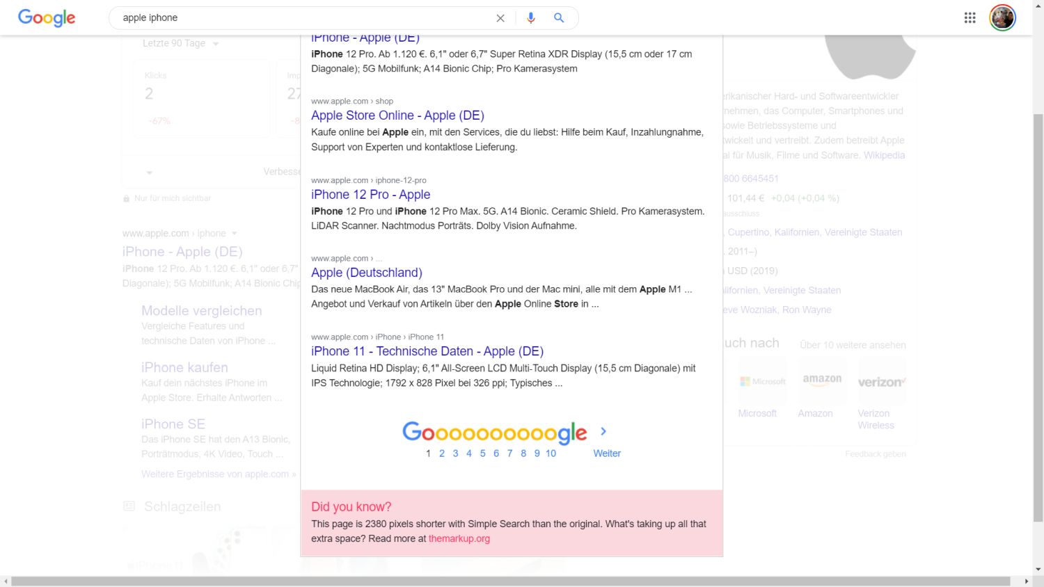 Als kleiner Seitenhieb informiert die Erweiterung darüber, wie viel Pixel eingespart worden sind, in dem die Meta-Inhalte entfernt wurden. Das können je nach Thema mehrere Tausend Pixel sein. Wenn Google eine Maps-Karte einblendet, einen langen Knowledge Graph integriert oder bei der Produktsuche eine endlose Ansammlung an Werbelinks veröffentlicht, ist das auch kein Wunder. Auf obigem Screenshot seht ihr, wie diese Darstellung funktioniert. Gebt nur mal „Apple iPhone“ als Beispiel ein. Da wird einem erst bewusst, wie sehr Google die reinen Suchergebnisse mittlerweile „versteckt“.