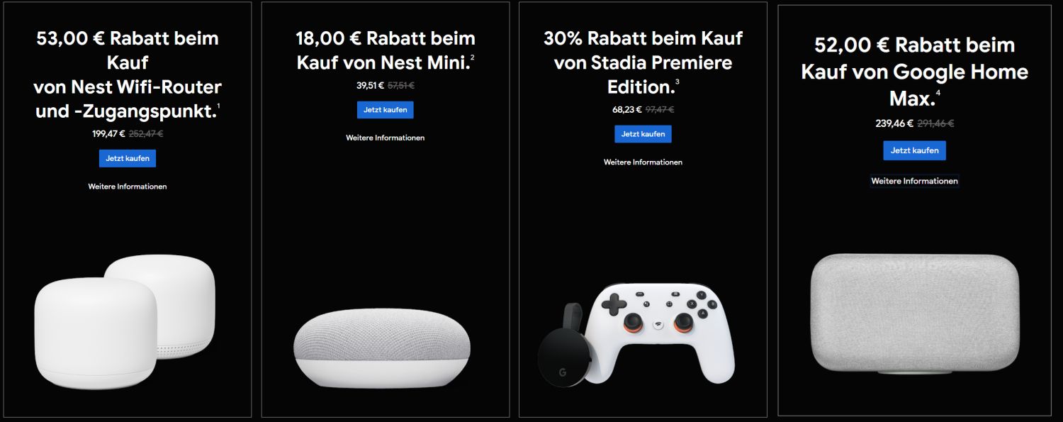 Leider sind die Aktionen nur wenig attraktiv und die erwarteten Rabatte auf weitere Produkte wie etwa den neuen Chromecast gibt es nicht. In den USA sind zumindest auch die Pixel-Smartphones reduziert zu haben, doch hierzulande ist keines dieser Angebote gestartet. Sehr enttäuschend. Im Folgenden findet ihr die Übersicht der Aktionen sowie die Bedingungen.