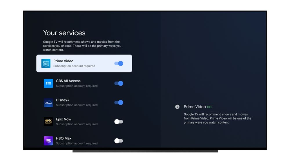 Google TV enthält nur Vorschläge von den Plattformen, die in der „deine Dienste“-Liste ausgewählt worden sind. Stelle also sicher, dass eine neu installierte Plattform an dieser Stelle aktiviert worden ist. Die großen Plattformen sollten automatisch nach der Installation oder durch Vorinstallation aktiviert sein.